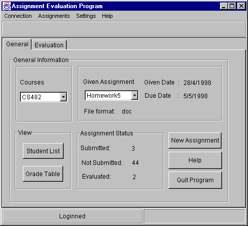 When the user enter the program he/she sees a GUI as in figure 18. The courses and corresponding assignments are listed in choice boxes. The user can see the number of submitted or evaluated assignment files easily. Figure 19 shows the evaluation part of the program. Through a very simple interface the users are able to see which students submitted their assignments, which ones evaluated or which ones are to be evaluated. When the Evaluate button is pressed the assignment viewer form becomes visible as it seen in figure 20.