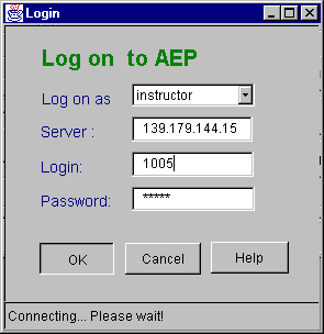 In order to use AEP Client program the users must log on to the system. Since there are two different user types (assistants, instructors) for this program, users must specify their category. The other requirements are same as the ASP Client login process. When the OK button is pressed first the given ASEP Server IP is checked and then user login and password is sent as a query to the database server to be validated. If they are confirmed the user logs in to the system. Figure 17 shows an example snap shot of the logging process.