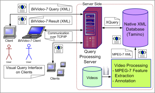 Users formulate queries on BilVideo-7 clients (Figure 2 below), which communicate with BilVideo-7 Query Processing server using an XML-based query language over TCP/IP. The Query Processing Server parses queries into subqueries, retrieves the required data from XML database using XQuery, executes subqueries, fuses outputs of subqueries and sends query results back to the clients.