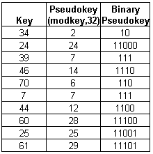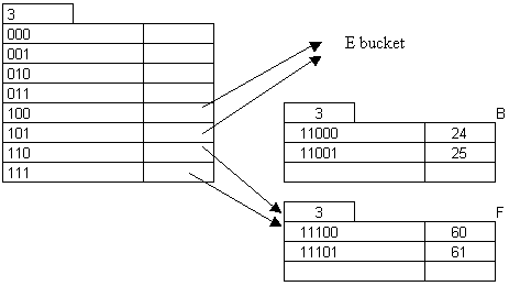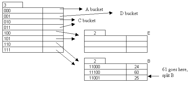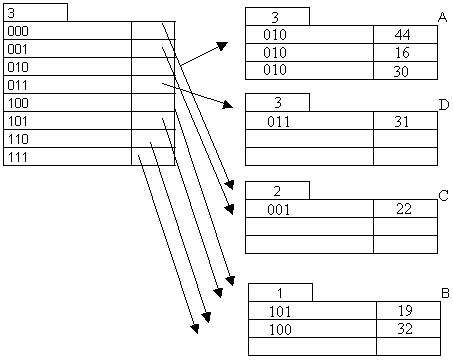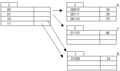 bucket depth (p): number of bits needed to distinguish the pseudo key on a page from those on other pages.