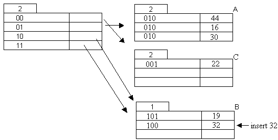 Insertion of 22 and 32: 22 (001) goes to A; since A is full again, we need to split.